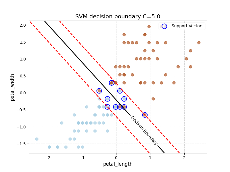 For simplicity and easier plotting we will also only consider two features of each flower. Here I have choosen the features petal length and petal width. For the curious: The petal is some specific leaf of iris flowers: Image of an iris flower. Finally let's write the driver code to load the data and feed it through the SVM classifier.